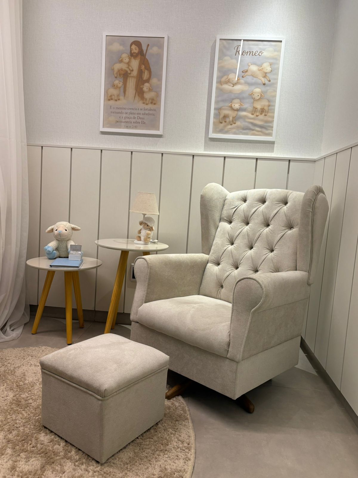 Apresentação do produto: Poltrona de Amamentação, assento com espuma D-23 com tratamento anti-mofo proporcionando mais conforto, sistema de balanço diferenciado em madeira com molas fixado com parafusos trazendo mais segurança, acabamento no tecido da sua escolha.