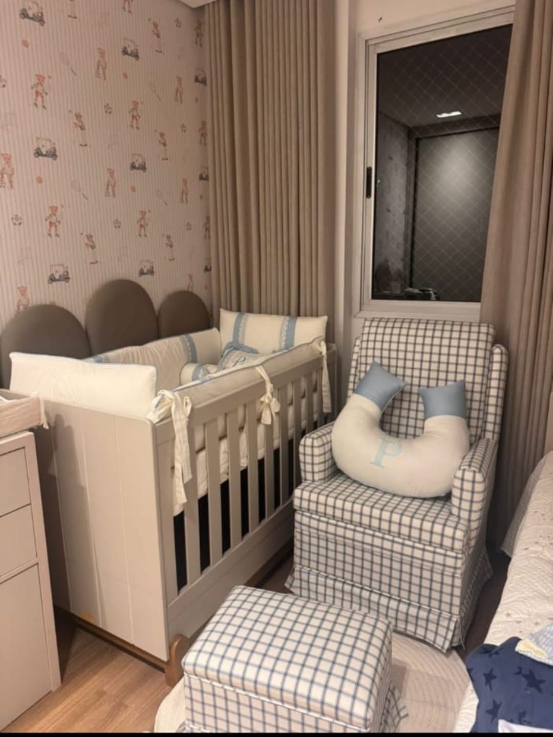 Poltrona amamentação fixa e puff grande, com plumante no encosto e acento removivel